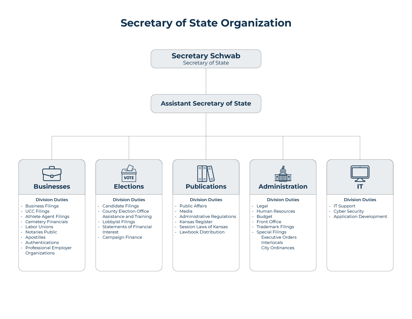 The Secretary of State's Office is comprised of five divisions: Businesses, Elections, Publications, Administration, and Information Technology (IT). Below is a breakdown of the office and the division duties.
